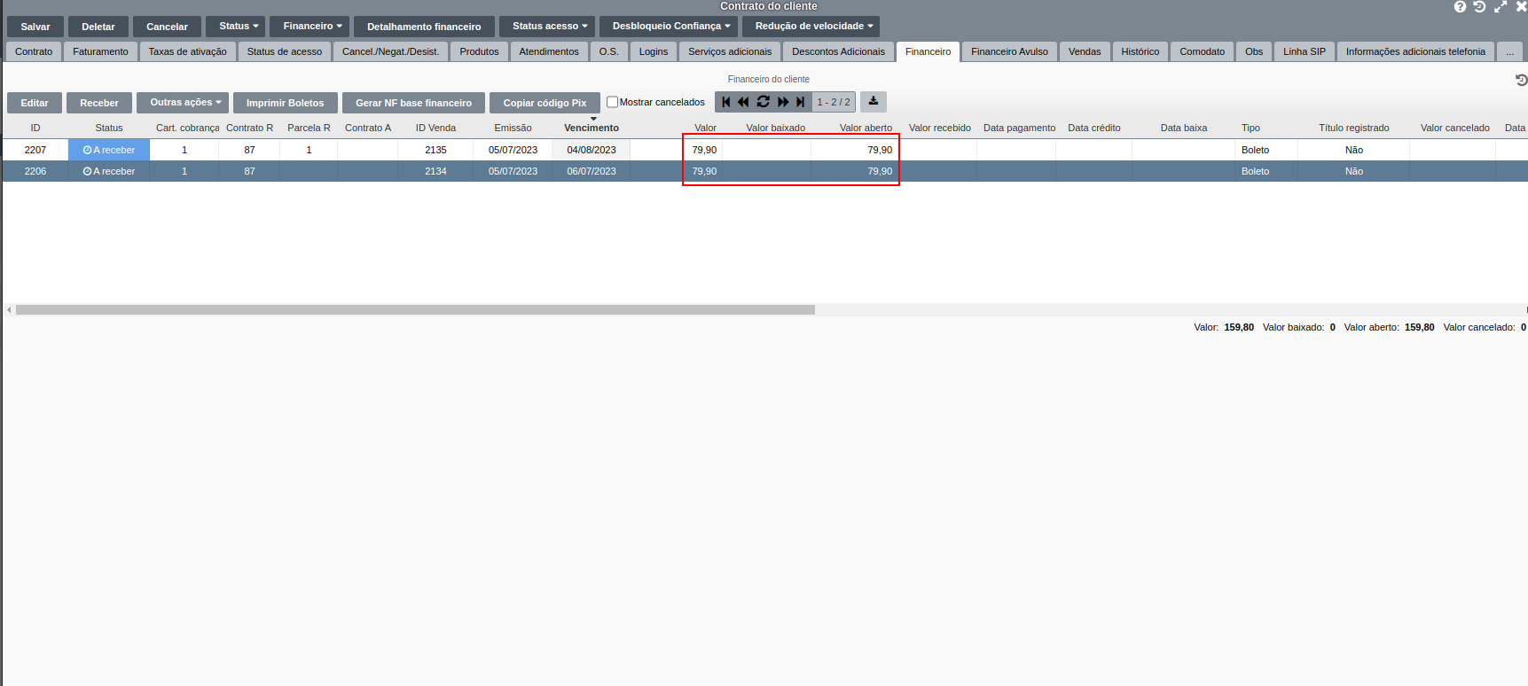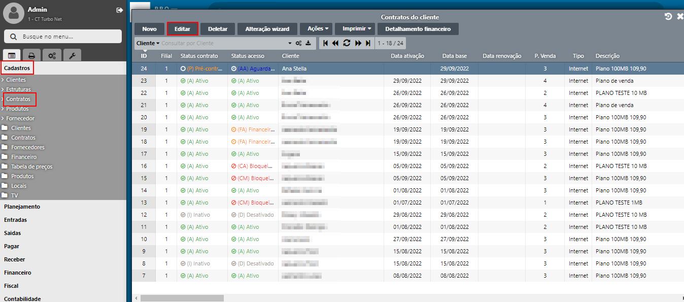 Para inserir o Desconto Adicional, no contrato do cliente, acesse: Menu Sistema ➜ Cadastros ➜ Contratos ➜ Selecione o contrato e clique no botão Editar. Conforme imagem abaixo: