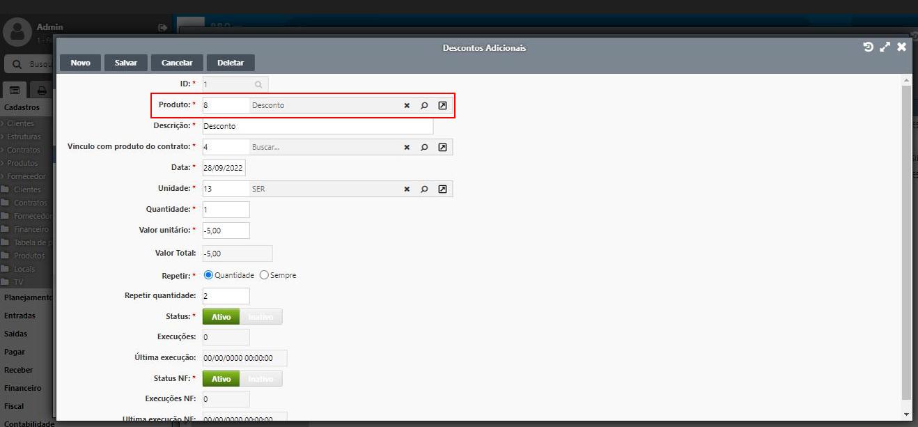🔹 Vinculo com produto do contrato: Insira em qual produto do contrato será concedido esse desconto;