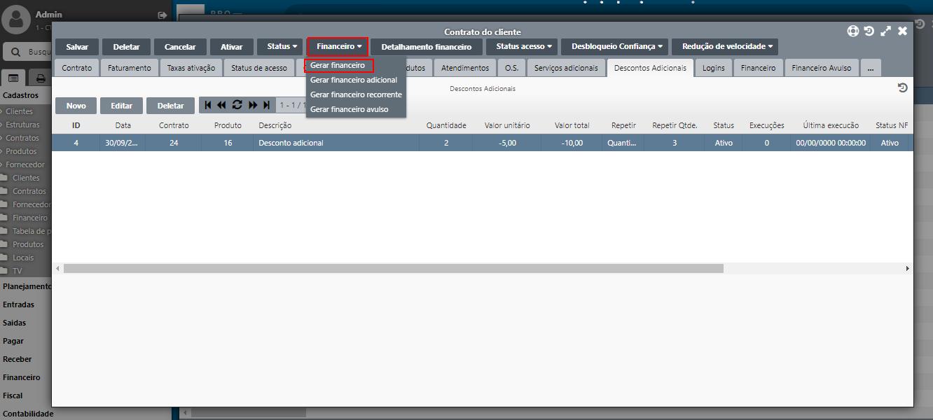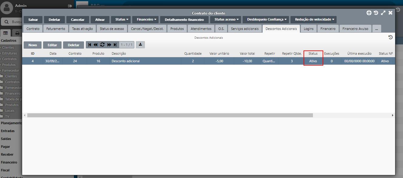 O Desconto Adicional ficará com status Ativo, até que seja executado o número de vezes que foi inserido em Repetir Quantidade.